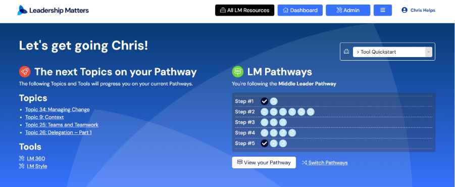 When you log into Leadership Matters, you’ll see the section pictured below. It tells you what content you’ll need to complete to progress. Under the LM Pathways heading, you’ll see which Pathway you are currently following as well as all the content for the Pathway.